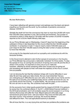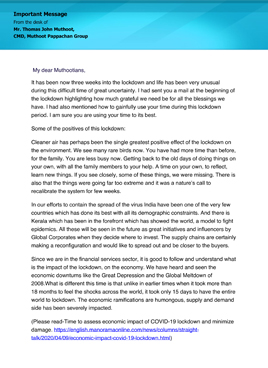Chairman & Managing Director’s Email to Muthootians on 27-March-2020